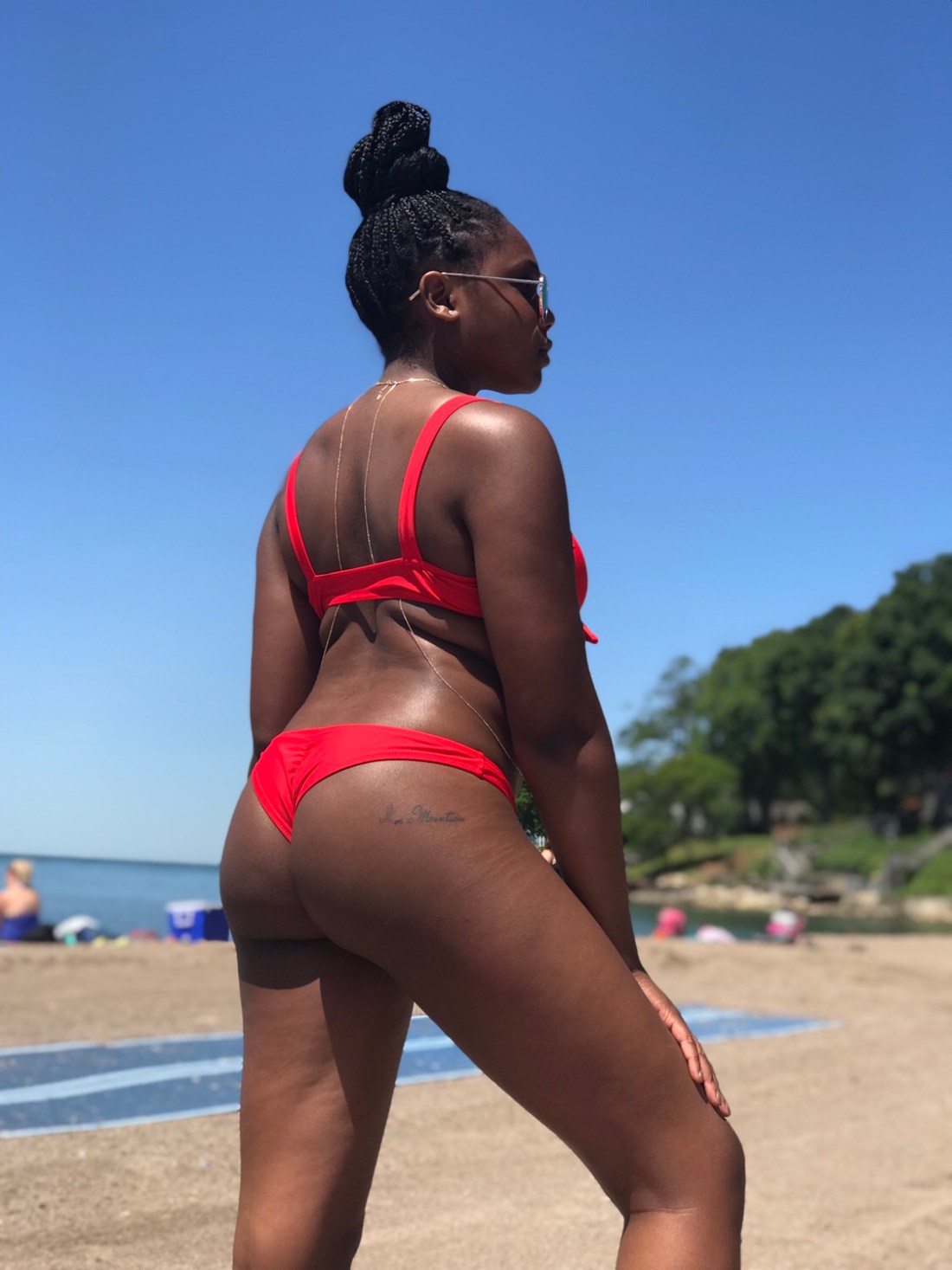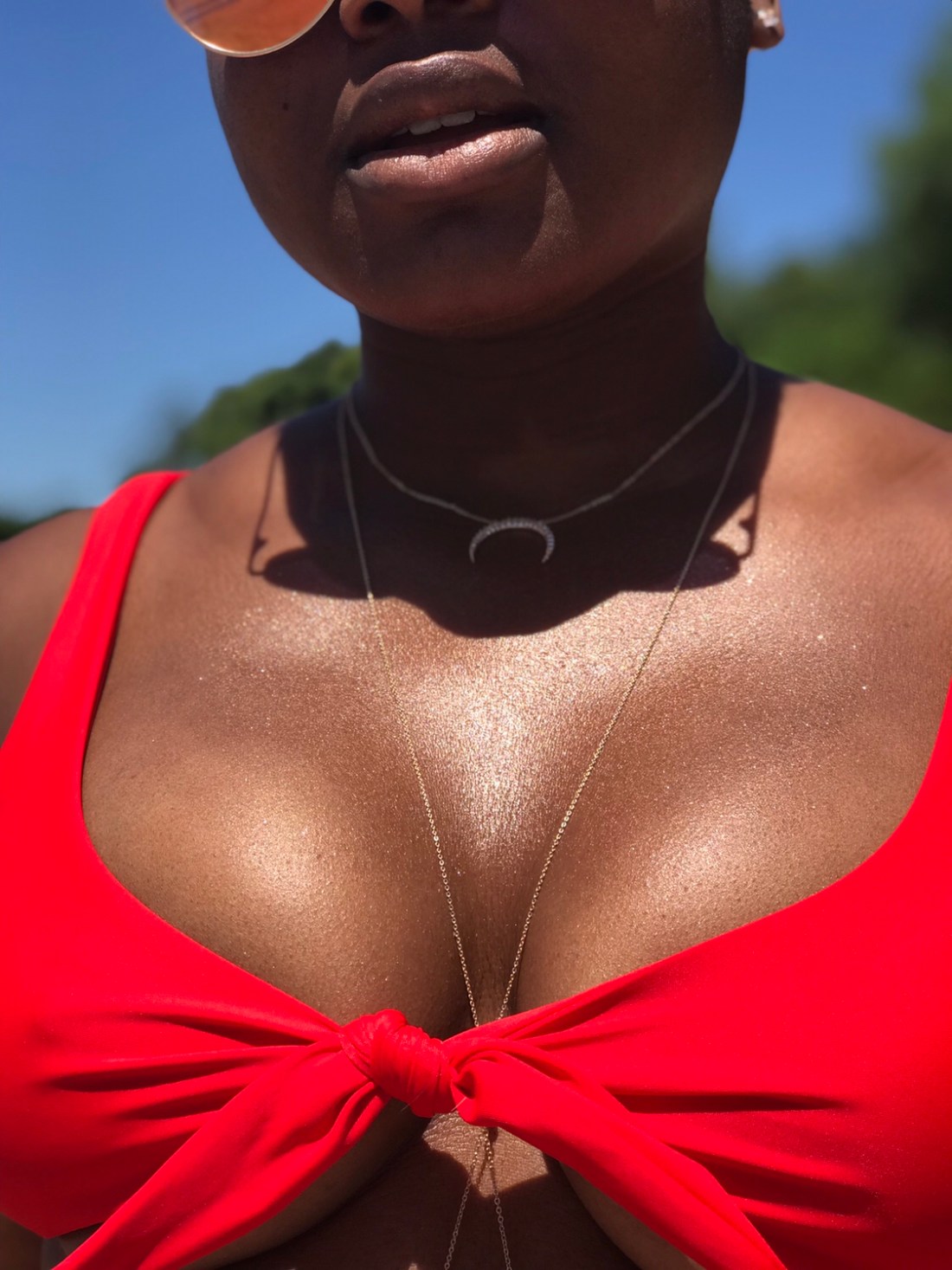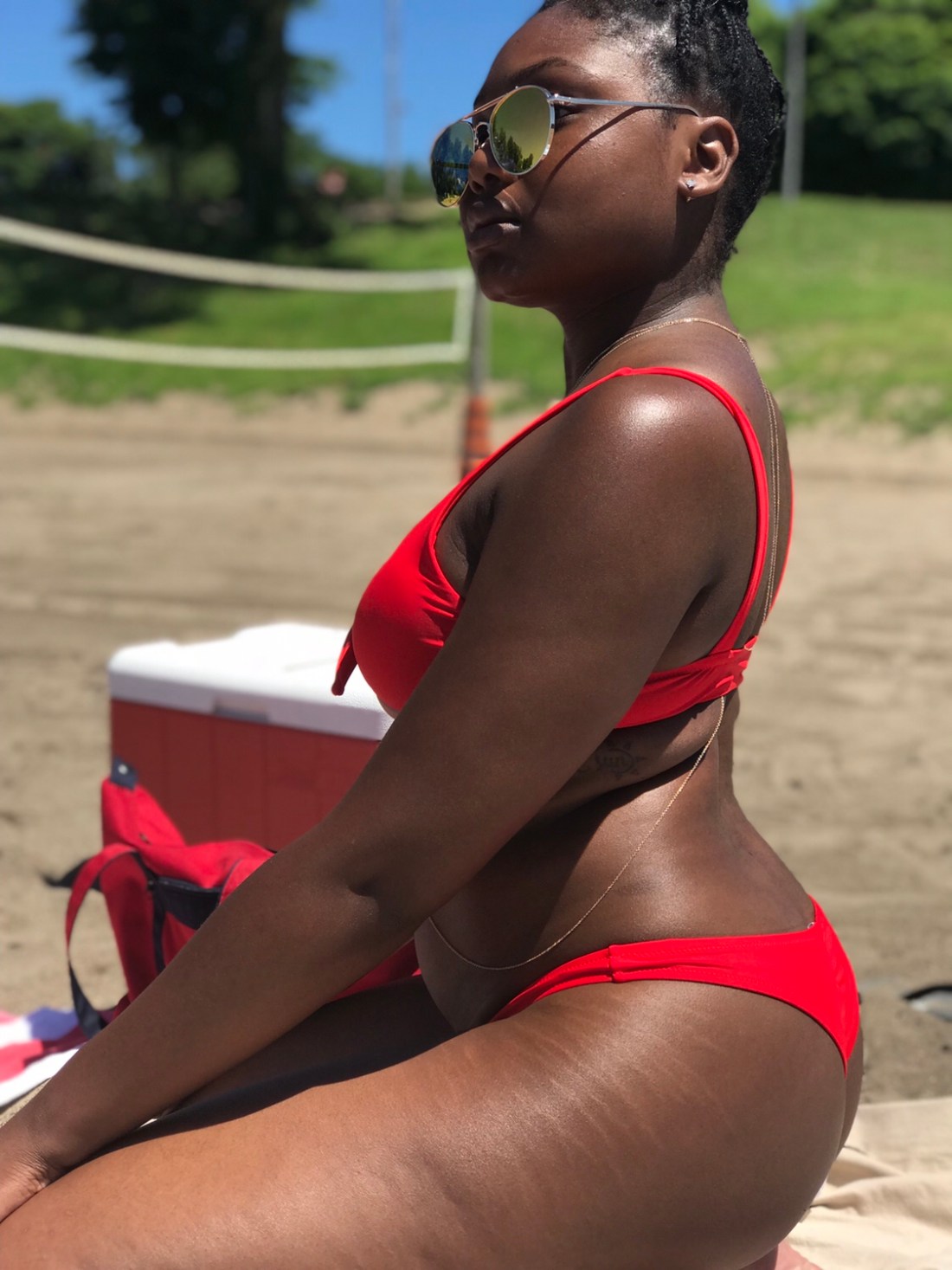My bikini is a cute little red number from Zaful. I paired it with sunglasses and a body chain from Aldo Accessories. My beautiful glow is all Fenty (I love you cousin RihRih), and I even went for a lil under boob. Life is good.