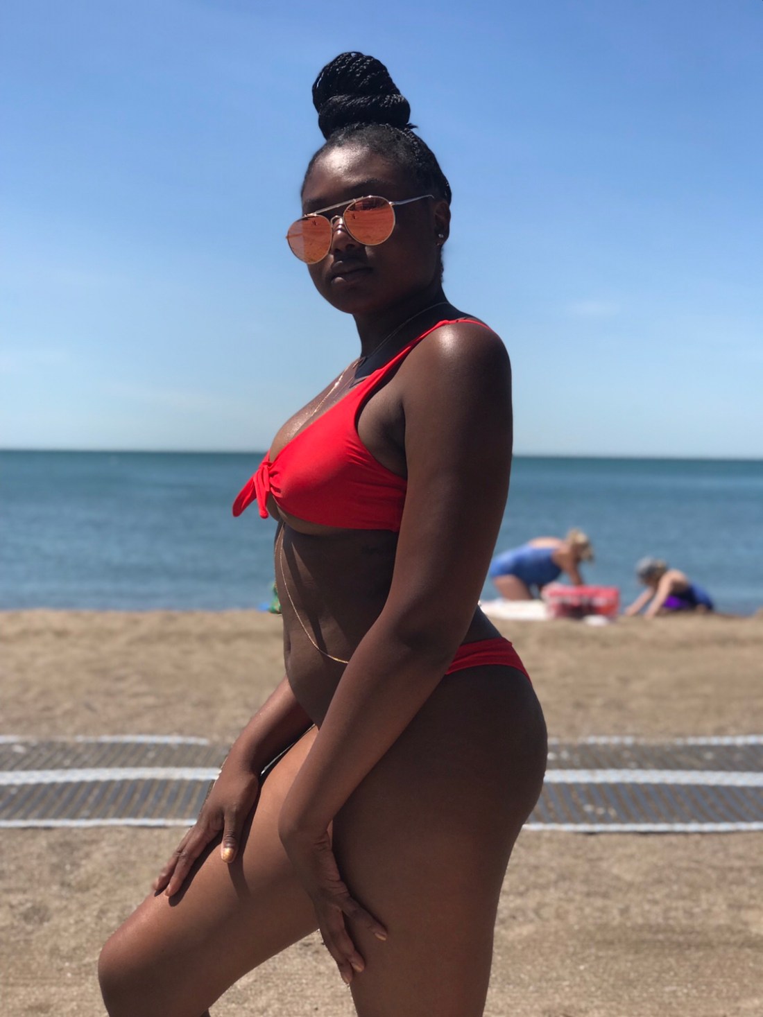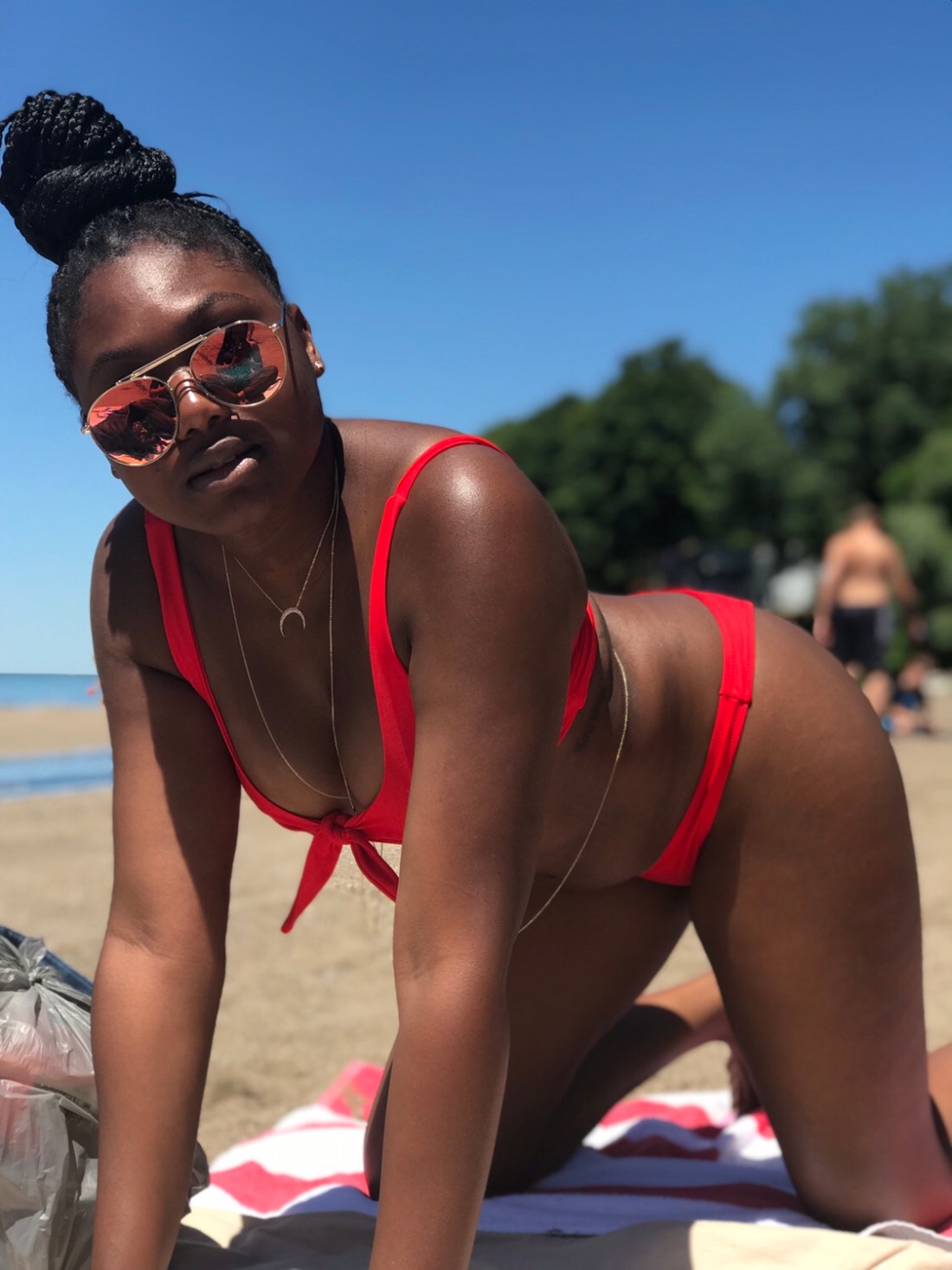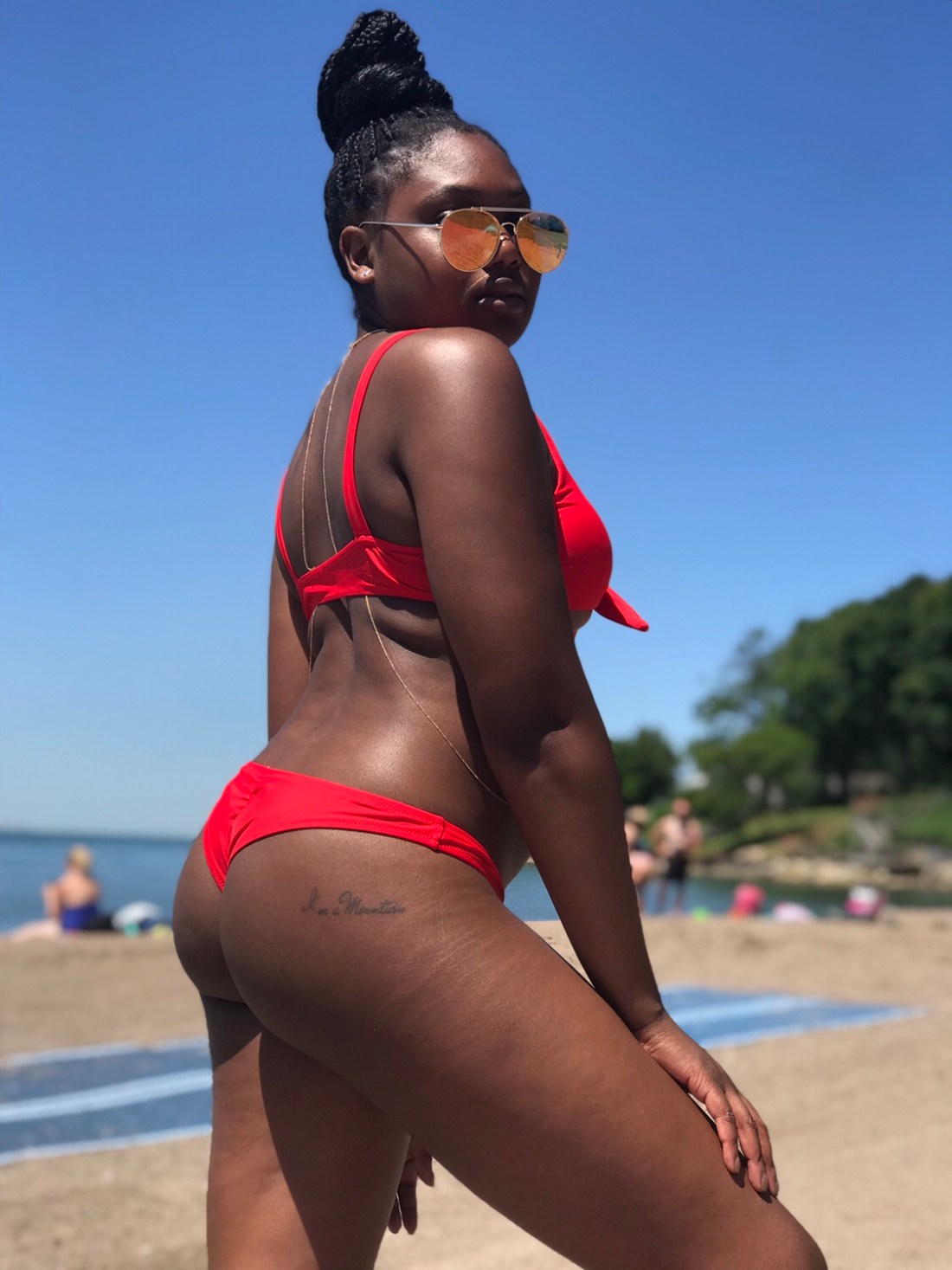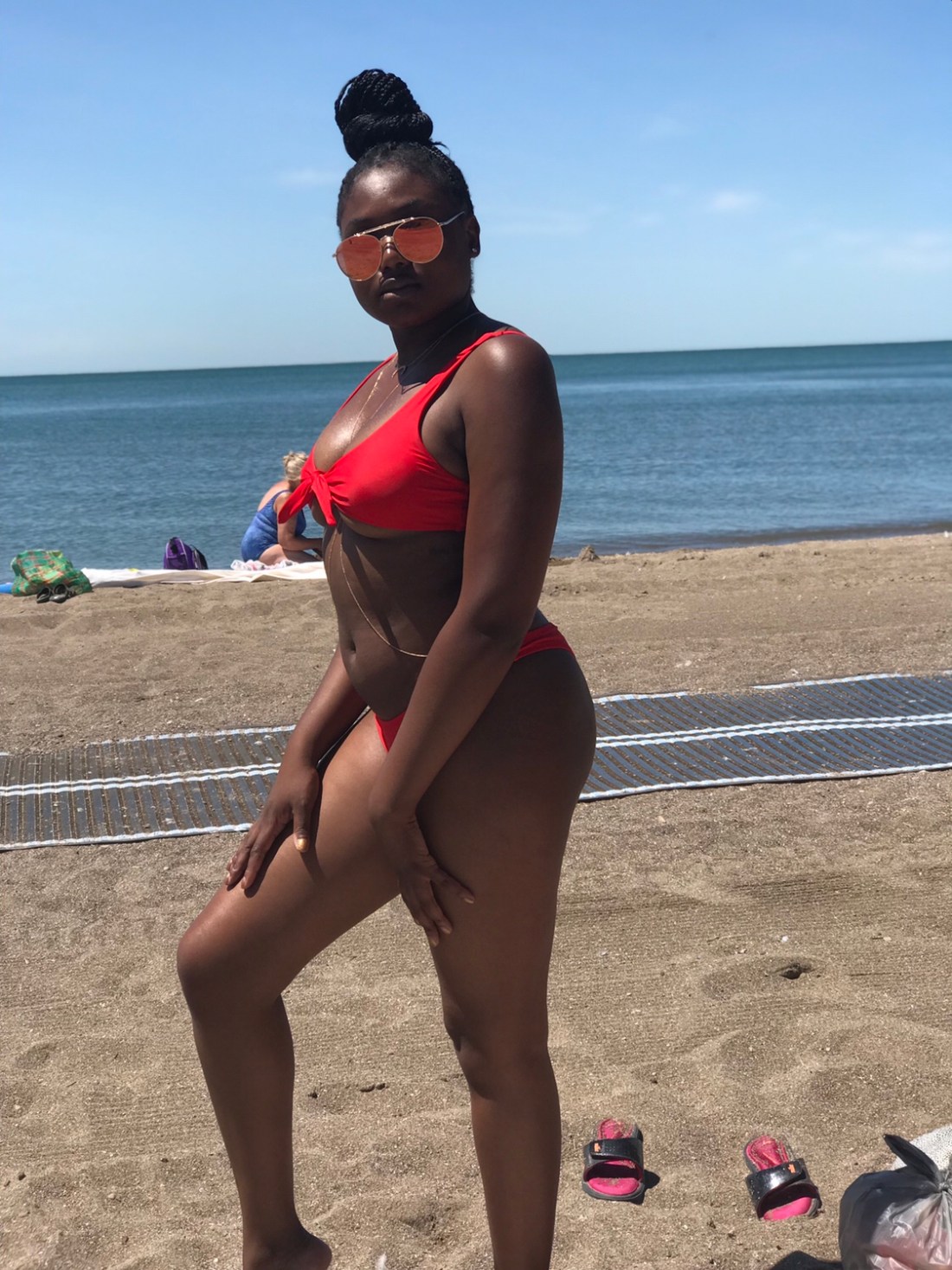My bikini is a cute little red number from Zaful. I paired it with sunglasses and a body chain from Aldo Accessories. My beautiful glow is all Fenty (I love you cousin RihRih), and I even went for a lil under boob. Life is good.