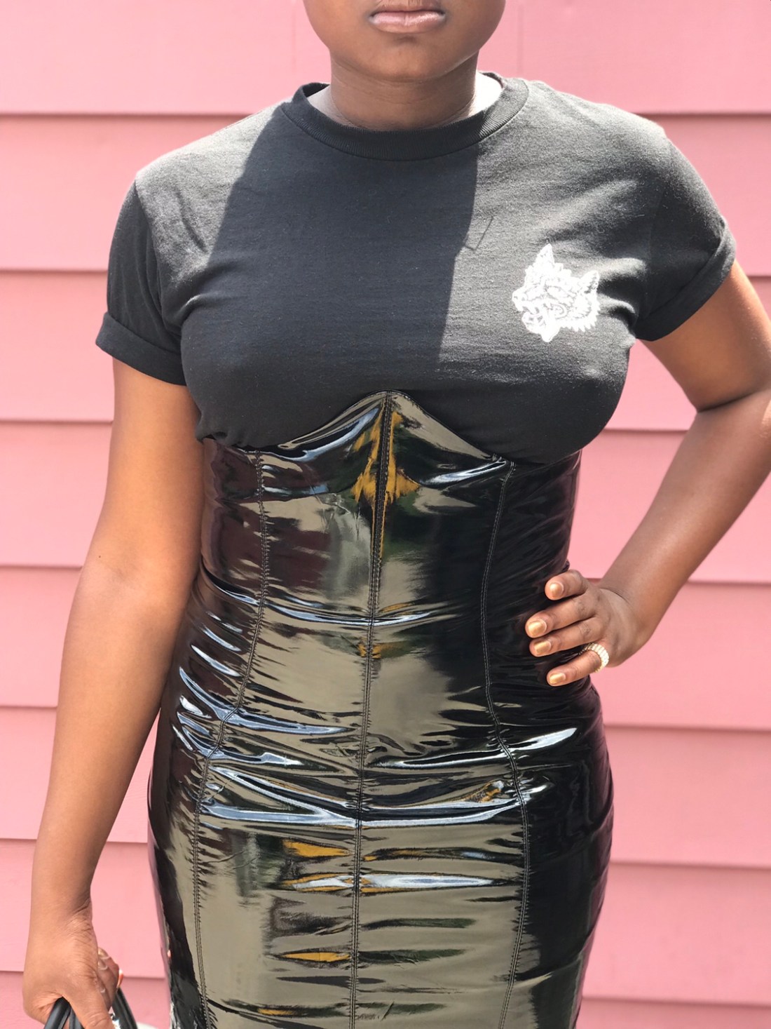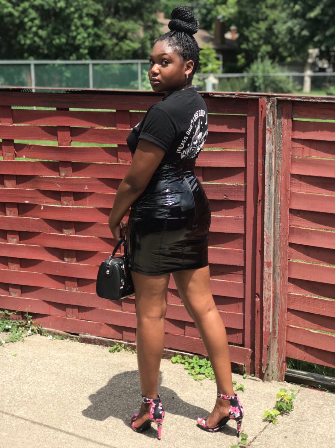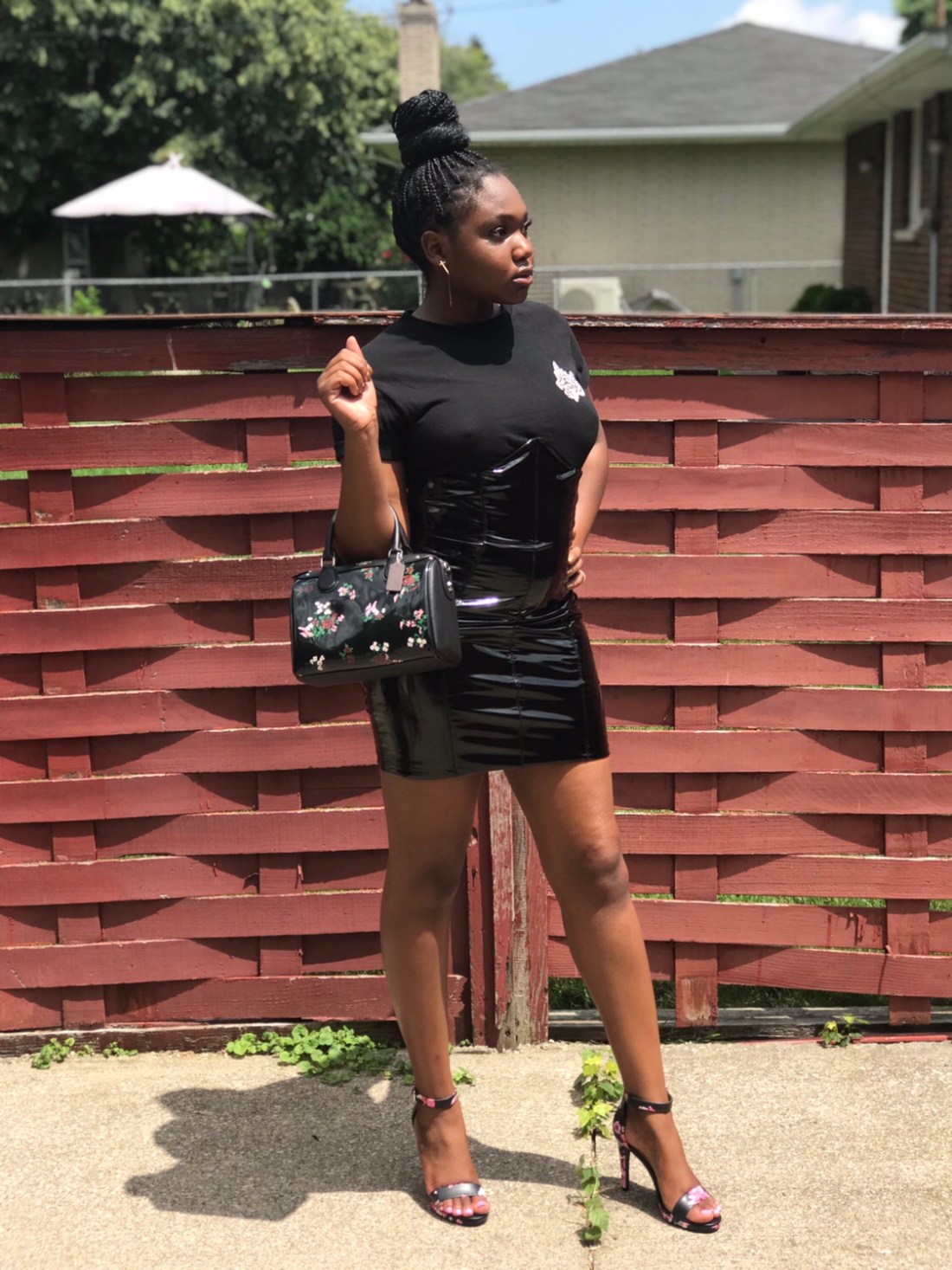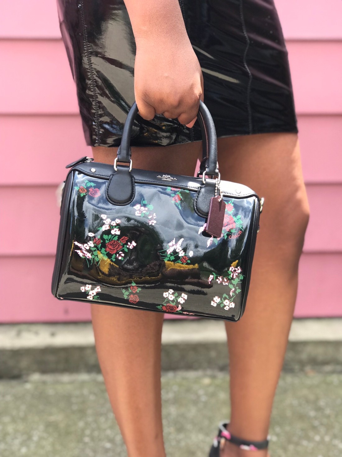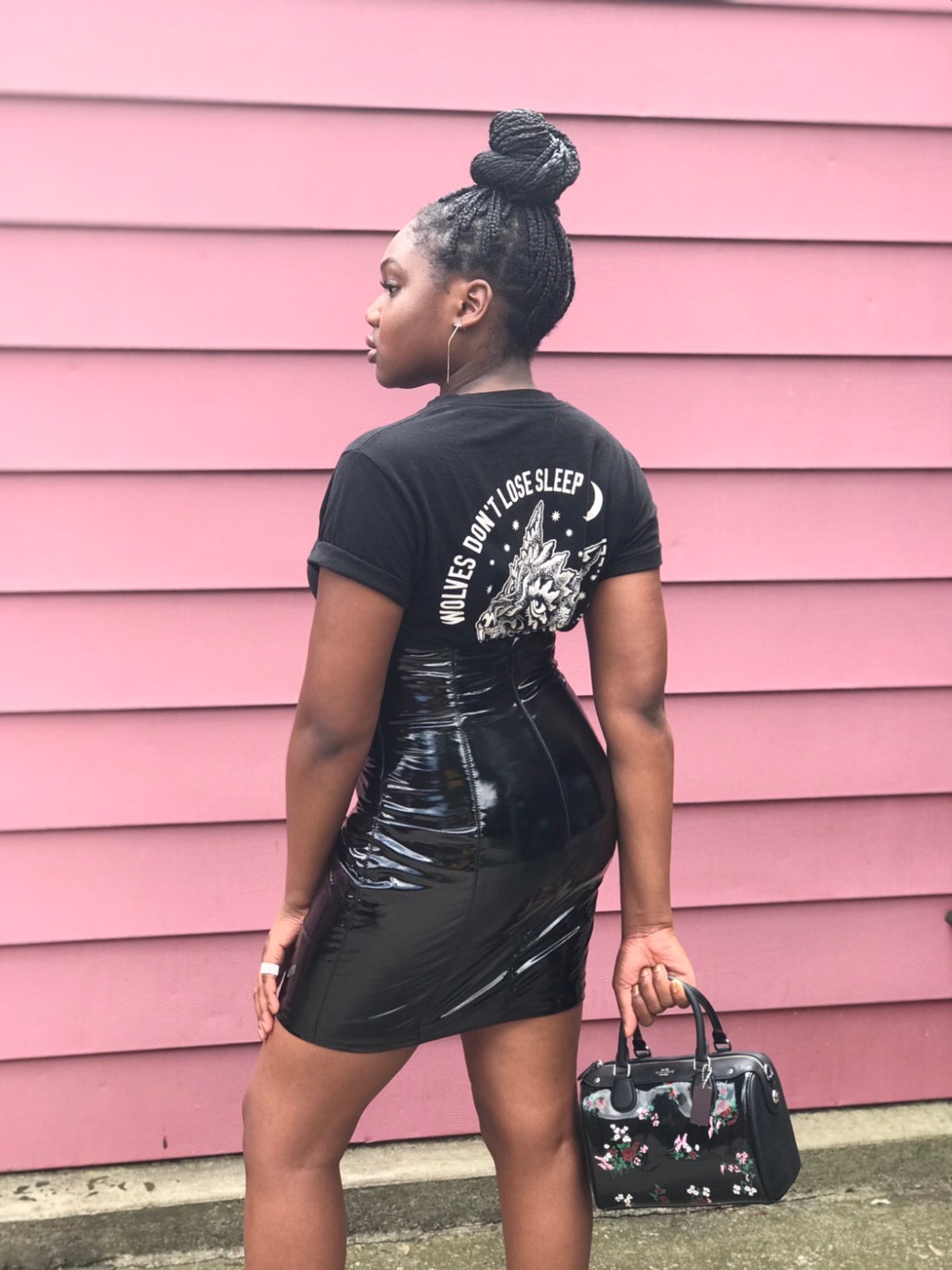 The highlight of this outfit is the skirt! I had wanted this skirt for months, but every time it was restocked it sold out before I could get my hands on it! I ended up getting it on ebay.com for half the price; God’s plan. It is a black vinyl skirt from mistressrocks.com, paired with a graphic t-shirt, floral heels from Le Chateau, and a floral Coach purse.